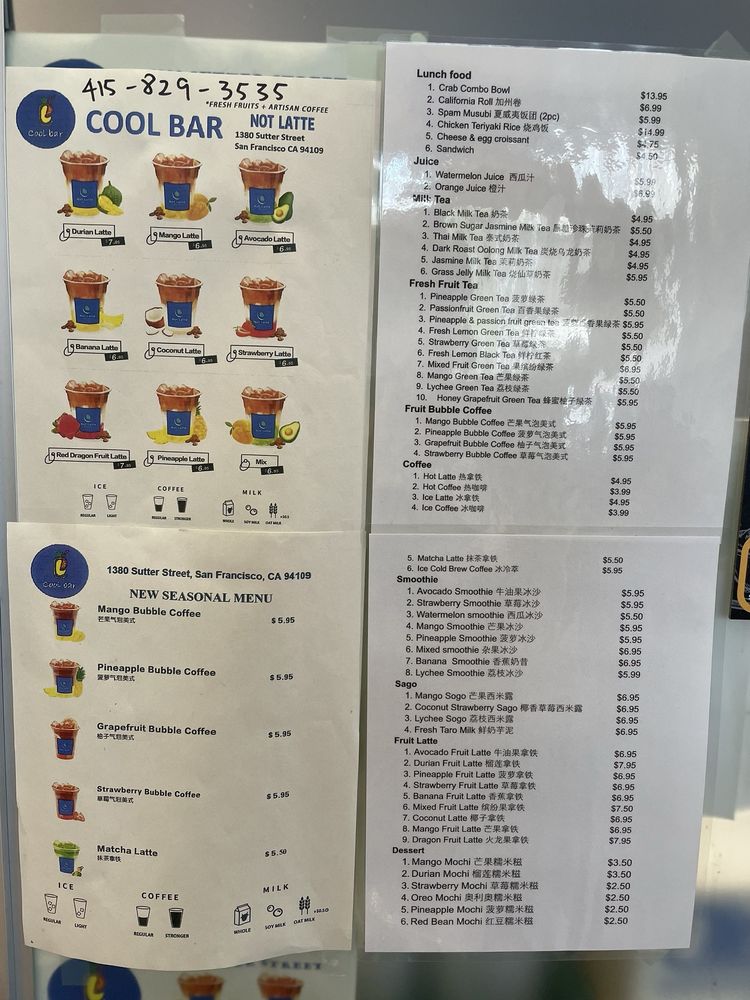 Located at 1380 Sutter St, San Francisco, CA, Cool Bar has quickly established itself as a go-to destination for boba enthusiasts. This charming spot offers a diverse menu featuring a delightful array of drinks, from rich black milk teas to refreshing fruit teas. Regular customers rave about the amazing quality, with standout offerings like mango fruit tea, taro drinks, and unique flavored lattes. The combination of fresh and vibrant ingredients guarantees a refreshing experience every visit.